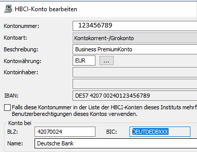 | Bleibt das Problem bestehen, bitte überprüfen Sie die BIC in den Stammdaten -> Bankzugänge -> HBCI -> Deutsche Bank Zugang -> Reiter "HBCI-Konten" -> Konto ändern: |
