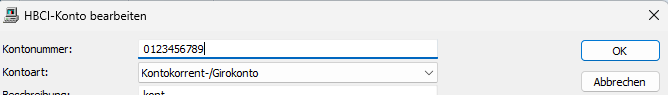 Können Zahlungen weiterhin nicht ausgeführt werden, dann wurde die Kontonummer nicht 10-stellig von der Deutsche Bank geliefert. Bitte die Kontonummer in dem Konto manuell mit 0 auf 10 Stellen auffüllen und mit OK bestätigen. In der Tabelle wird das Konto weiterhin ohne 0 angezeigt.