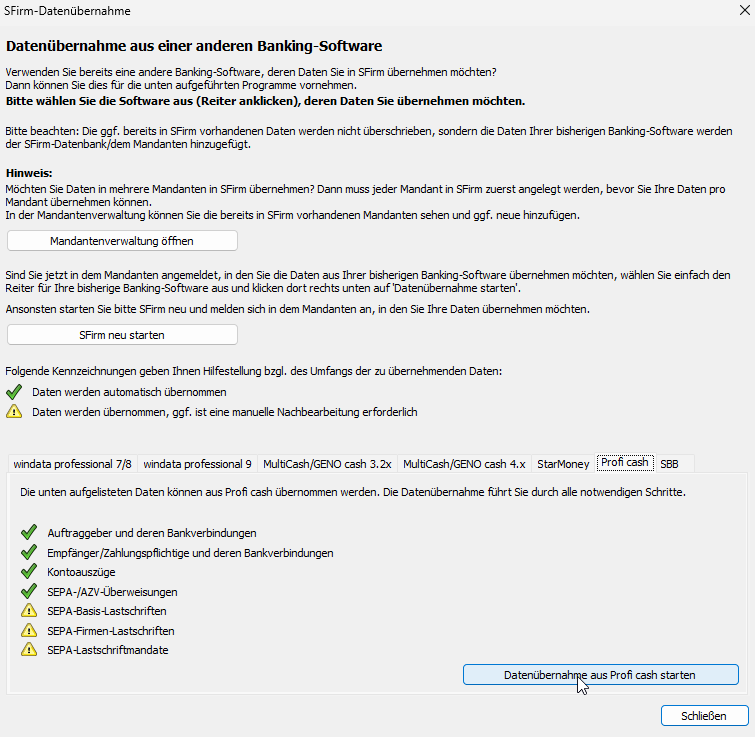 Die Übernahme der Daten aus Profi cash in SFirm ist somit abgeschlossen.