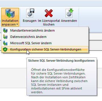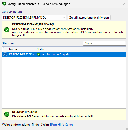 Mit dem Patch 26.04 gibt es in SFirm 4 die Möglichkeit, eine sichere SQL Server-Verbindung zu aktivieren, die eine strengere Zertifikatsprüfung enthält. Dadurch wird sichergestellt, dass die Daten zwischen SFirm und den SQL Server-Instanzen besser abgesichert übertragen werden.
