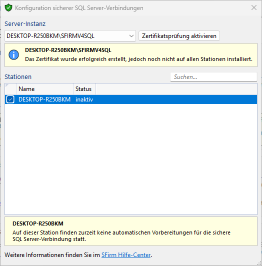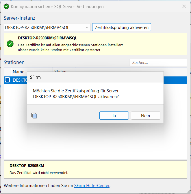 3. Nach der erfolgreichen Installation des Zertifikats auf den Stationen kann „Zertifikatsprüfung aktivieren“ gewählt werden, um die sichere SQL Server-Verbindung mit strengerer Zertifikatsprüfung zu aktivieren. Es folgt eine Nachfrage, die mit „Ja“ bestätigt werden muss.